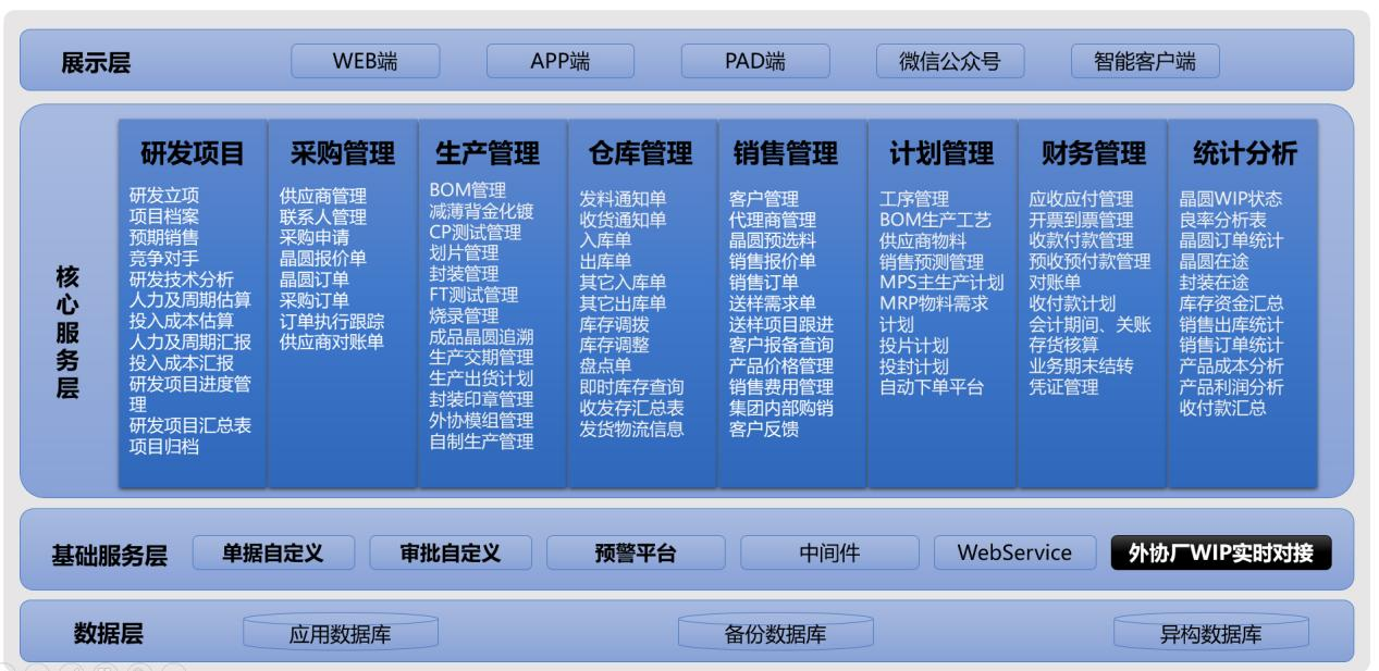 集成外協廠WIP實時數據對接、研發項目管理(lǐ)、銷售預測、MRP、投片、投封計劃、CRM客戶關系管理(lǐ)、單據審批流、單據自定義、預警平台等功能(néng)